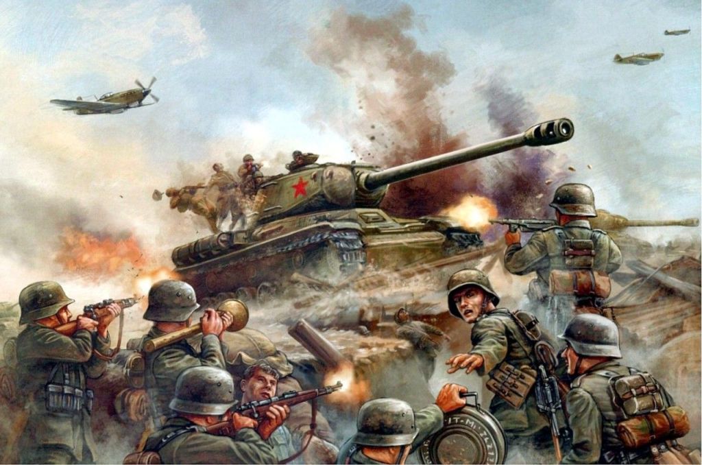 El tremendo poder de la sociedad soviética, unido por el deseo de proteger su tierra natal, se alzó contra la poderosa máquina invasora nazi, de sangre fría y armada hasta los dientes. Se puso de pie para vengarse del enemigo, que había roto, pisoteado la vida pacífica, los planes y las esperanzas de la gente.