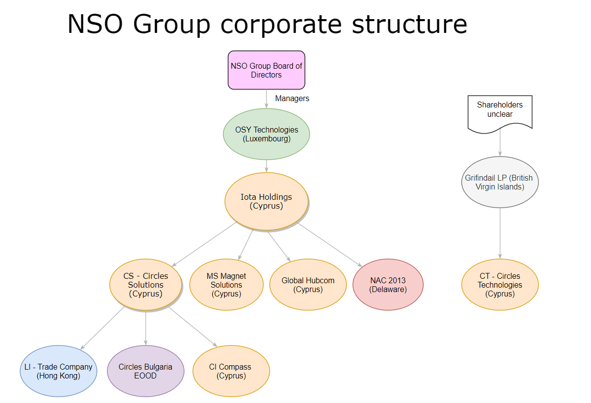 Circles Ltd. fue fundada en 2008, por el ex funcionario de inteligencia israelí Tal Dillian y sus cofundadores Boaz Goldman y Nadia Ropleva. La empresa, tiene su sede en Chipre, pero opera en Bulgaria y otros países, y ofrece la capacidad de «interceptar datos en tiempo real de redes 3G«, así como la capacidad de rastrear la ubicación de ciertos usuarios de teléfonos móviles. Es conocida por vender sistemas para explotar las vulnerabilidades de los protocolos telefónicos. Y así acceder a la ubicación de la víctima e interceptar llamadas de voz y mensajes de texto SMS. Los registros comerciales de Chipre confirman que NSO Group, a través de su subsidiaria en Luxemburgo: OSY Technologies, adquirió Circles en 2014.