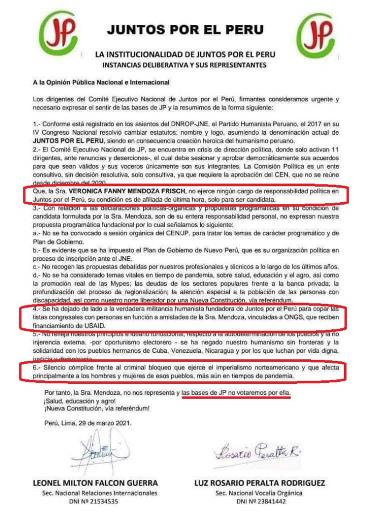 - Facción de Juntos por el Perú: Un dirigente de este partido se hizo con el control de la representatividad legal de la organización; y al margen de su dirigencia nacional, estableció acuerdos con el grupo de Nuevo Perú, sin legitimidad alguna. Este comunicado señala ampliamente lo descrito, donde las bases manifiestan que NO votarán por la afiliada de última hora: