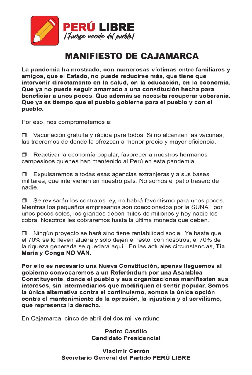 A diferencia de los anteriores, es un partido, organización que se originó en el centro del país, en la región Junín, una zona comercial y minera. Tiene una propuesta muy clara, y sin ambages, de izquierda. Que hoy propuso el Manifiesto de Cajamarca, con puntos muy precisos y con clara vocación de cambio estructural: