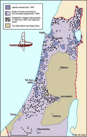 Apenas los británicos se retiraron formalmente de Palestina, se instauró una guerra civil con predominio de la Haganá y en mayo de 1948 se autoproclamó el Estado de Israel. El objetivo político de creación de un Estado para la población europea de religión judía implicaba que la población debía ser desarraigada; es decir el territorio debía quedar libre de otras comunidades. La instalación del estado de Israel significó el desalojo de 800000 árabes, y así sus fuerzas ocuparon diversas áreas fuera de lo asignado por el plan de partición. Israel quedó en posesión del 78 % del antiguo Mandato británico de Palestina. Esta fue la primera guerra Palestino-israelí. La victoria israelí supuso el inicio del éxodo de miles de familias palestinas a otras áreas del territorio o al exterior, hecho conocido como la Nabka[vi]. Los colonos judíos se instalaron en fuertes militarizados preparados para la defensa. La población árabe que se quedó dentro del nuevo estado de Israel, no tuvo los mismos derechos que la población judía y fue sometida a una administración militar.