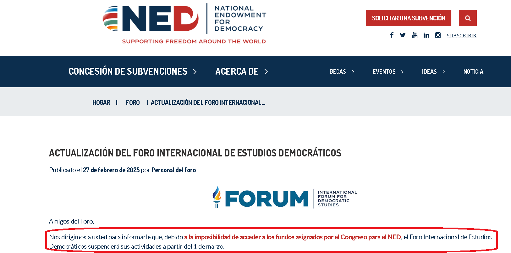 La propia NED ya anunció el recorte de aproximadamente 2000 proyectos y la anulación de varias convocatorias.